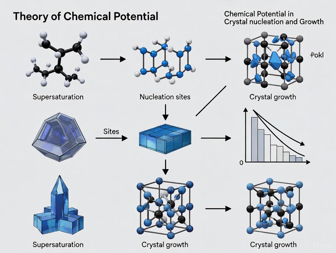 This article provides a comprehensive exploration of the theory of chemical potential and its pivotal role in governing crystal nucleation and growth. It establishes the foundational principles of Classical Nucleation Theory (CNT), where chemical potential (Δμ) serves as the key thermodynamic driving force. The scope extends to modern methodological advances, including machine learning-driven molecular dynamics and ab initio-based approaches, which enable quantum-accurate predictions of crystallization kinetics. The article further details practical strategies for troubleshooting and optimizing crystallization conditions—critical for producing high-quality crystals in pharmaceutical development. Finally, it examines the rigorous validation of theoretical models against experimental data and compares performance across different computational and material systems. Designed for researchers, scientists, and drug development professionals, this review synthesizes fundamental theory with cutting-edge applications to empower the design of materials with tailored crystalline properties.
