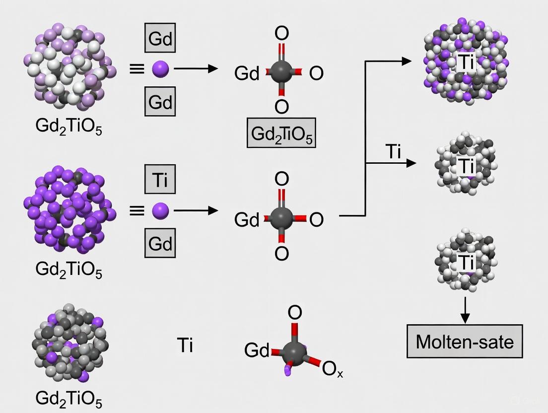 This article provides a comprehensive comparison between molten salt synthesis (MSS) and conventional solid-state synthesis (SSS) for fabricating gadolinium titanate (Gd₂TiO₅), a material of significant interest for nuclear applications and advanced ceramics. We explore the foundational principles of Gd₂TiO₅, including its crystal structure and key properties. A detailed methodological analysis contrasts the mechanisms, parameters, and procedural steps of MSS and SSS. The review further addresses common synthesis challenges and optimization strategies, supported by data on phase purity, reaction kinetics, and microstructural characteristics. Aimed at researchers and scientists in materials development, this analysis validates the superior efficiency of MSS and discusses its implications for producing high-performance materials for biomedical and clinical research, such as in radiation shielding or targeted drug delivery systems.
